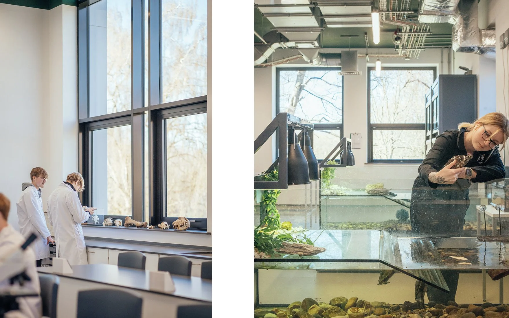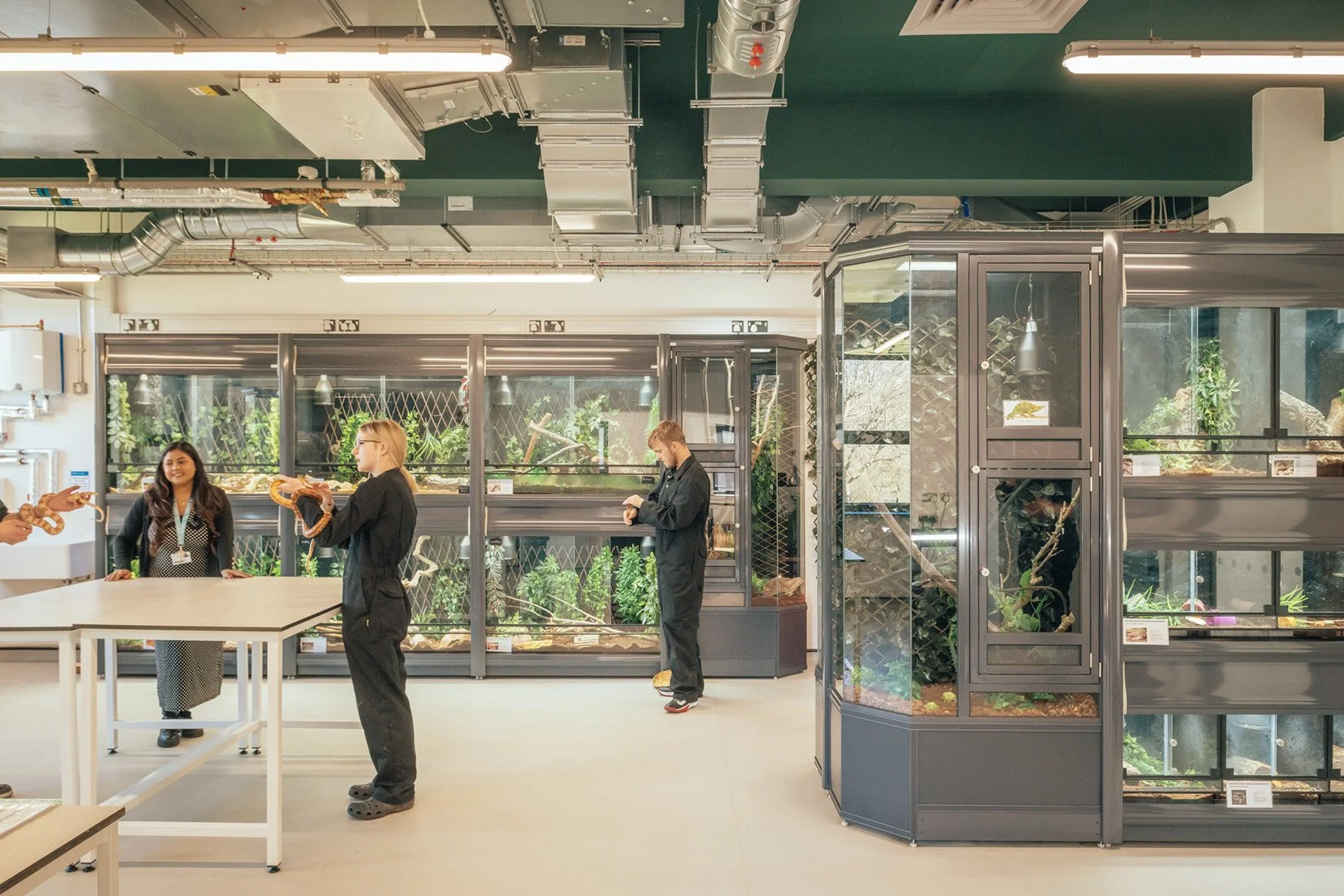 Specialist spaces are integrated with flexible teaching and learning spaces to educate students in animal care and husbandry. The building has been kitted out with innovative new enclosures that house up to 100 domestic and non-domestic animals over 40+ species.