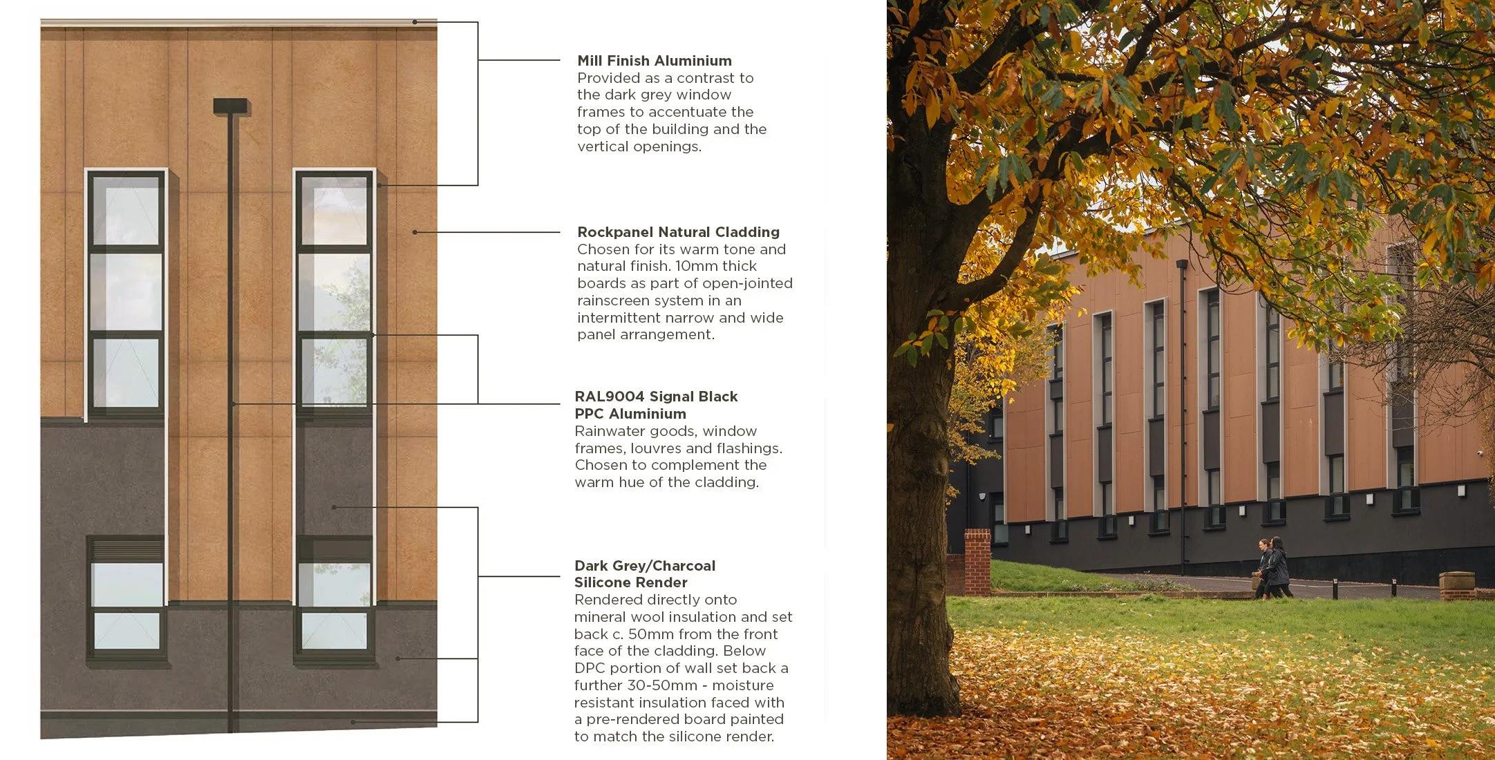 A contextual and cohesive architectural approach allowed the building to feel harmoniously part of the campus, whilst overcladding with insulation and a facade strategy that is directly informed by the vertical emphasis and grouping of windows inherent within the main Broadway college buildings.